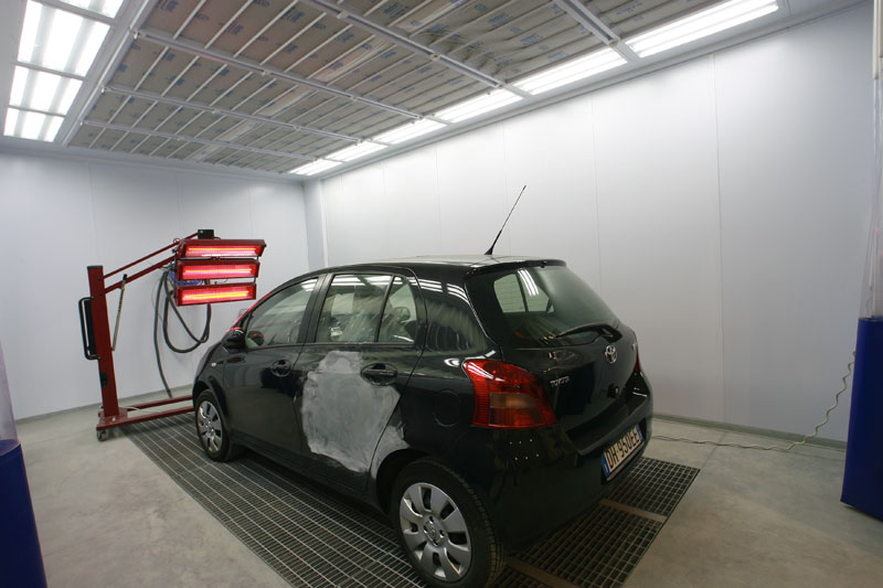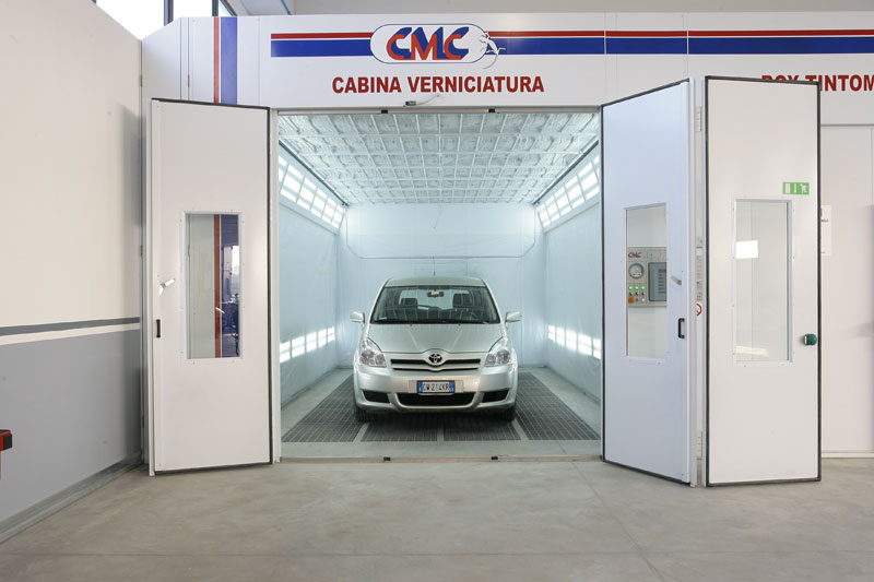 - n.1 zona verniciatura dotata di : cabina verniciatura riscaldata e ventilata CMC con un volume d’aria a ricircolo pari a 32.000 mc /minuto, un box colorimetria con due tintometri di marchi differenti per garantire una ricerca completa ed affidabile di ogni punto tinta delle vetture, un magazzino stoccaggio prodotti verniciati.